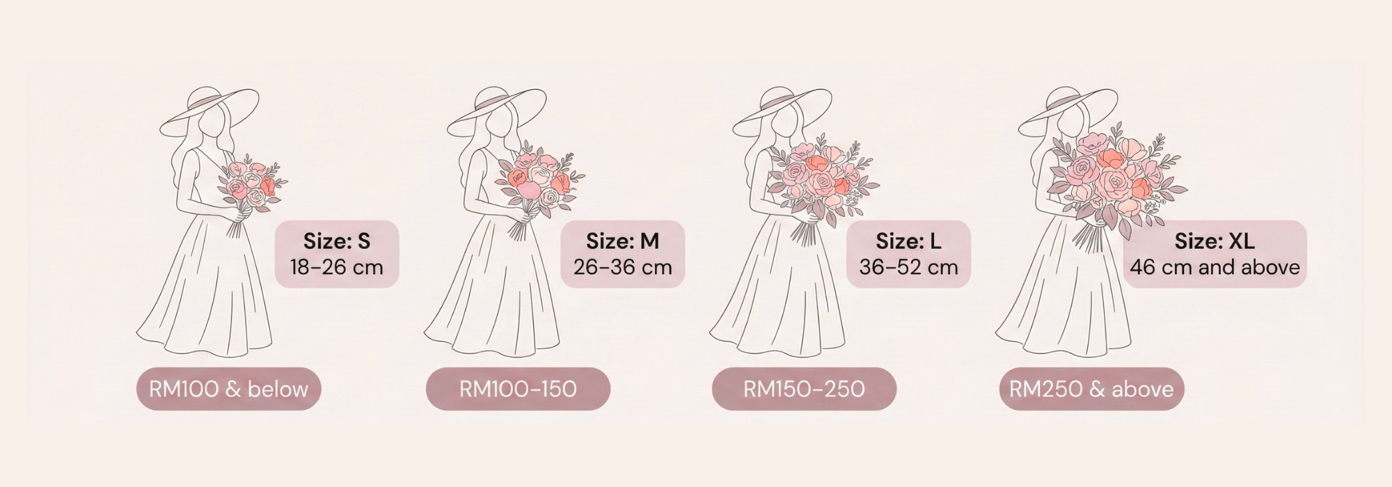 Bouquet Size S M L XL Flower Origin Local Mix Mix Imported Filler Origin Local Local Imported Imported Specifications Classic Ordinary Special Rare