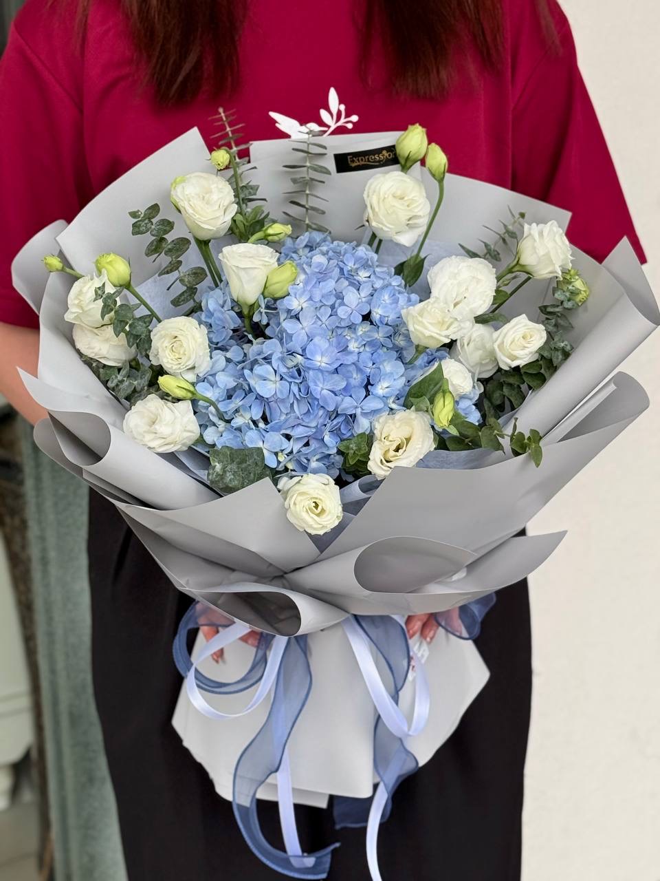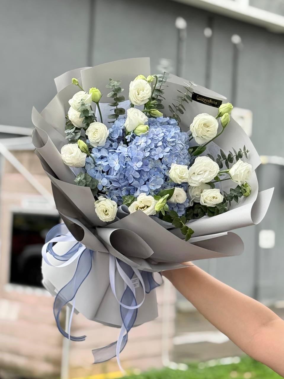 This special designed Bleu Celeste bouquet depicts the personality of someone with the softest heart. Did someone just pop into your mind? This soft blue hydrangea hand bouquet is paired with white eustoma and wraps in soft grey that makes the arrangement pop.