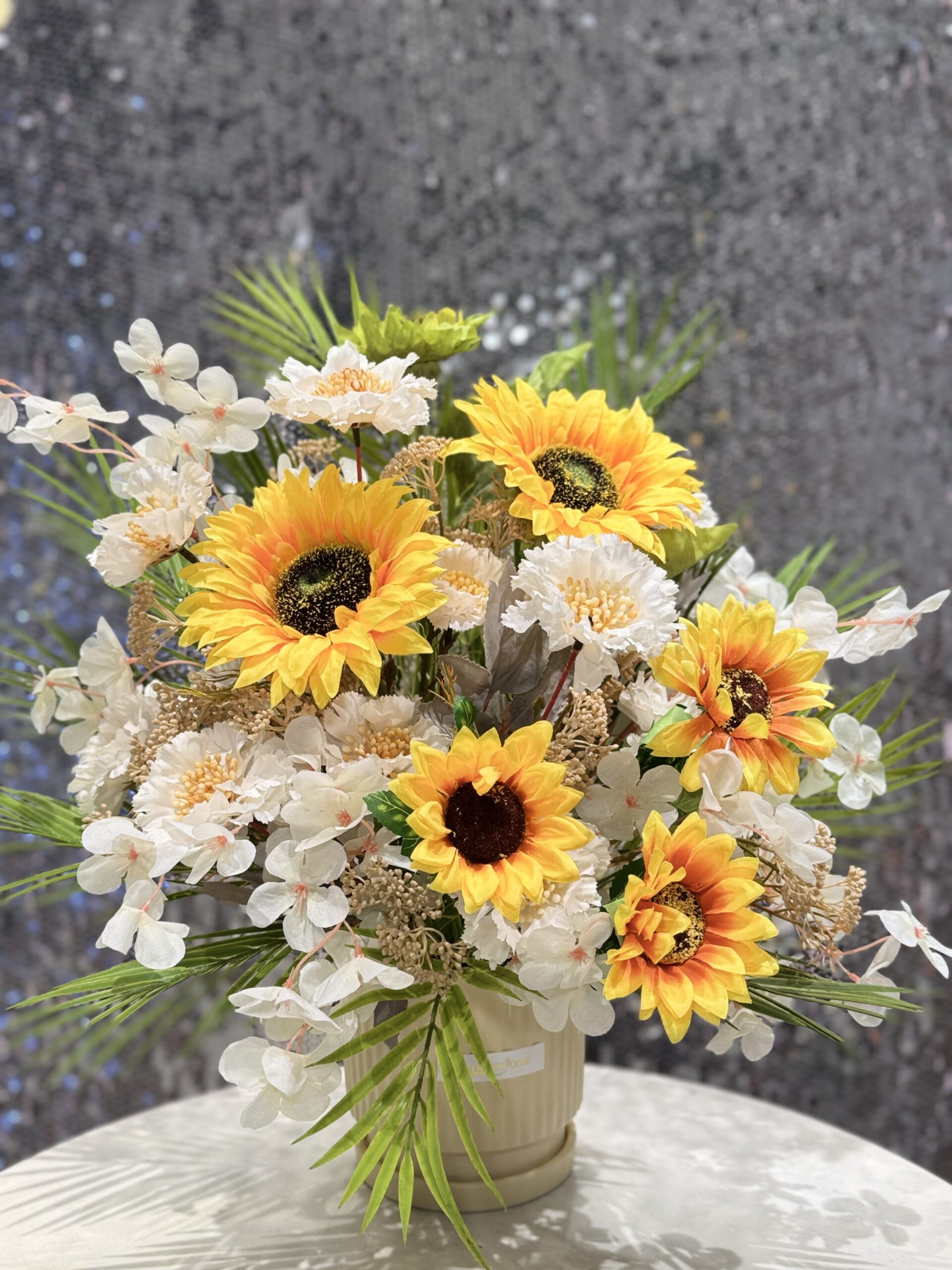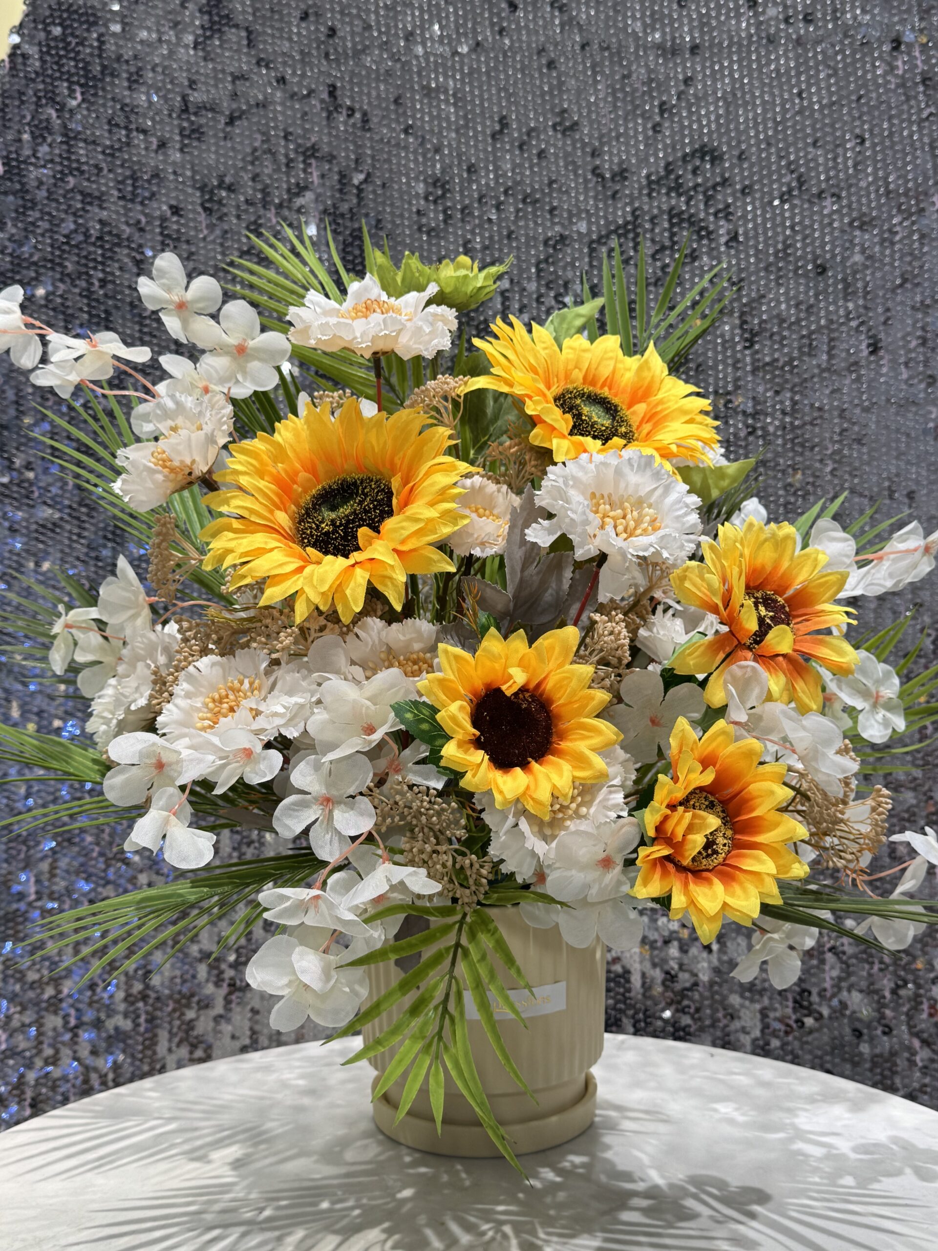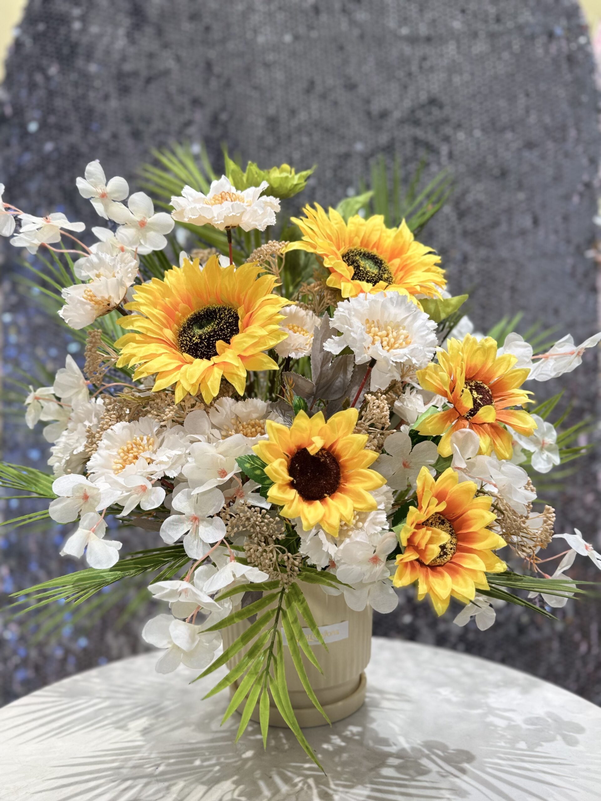 A gift to impress, a moment that’ll last. Bring on this cheering sunflower to your loved one. Each pot is decorated to perfection with white flower as a highlight to brigh up the whole design. Wish your loved ones, colleagues or friends a Happy way in style.