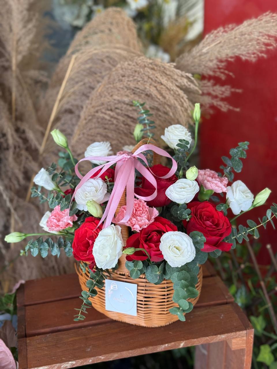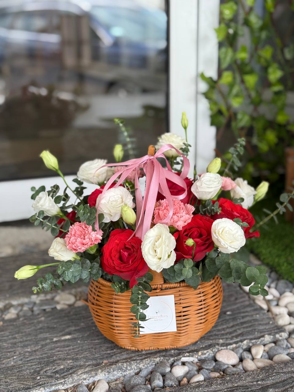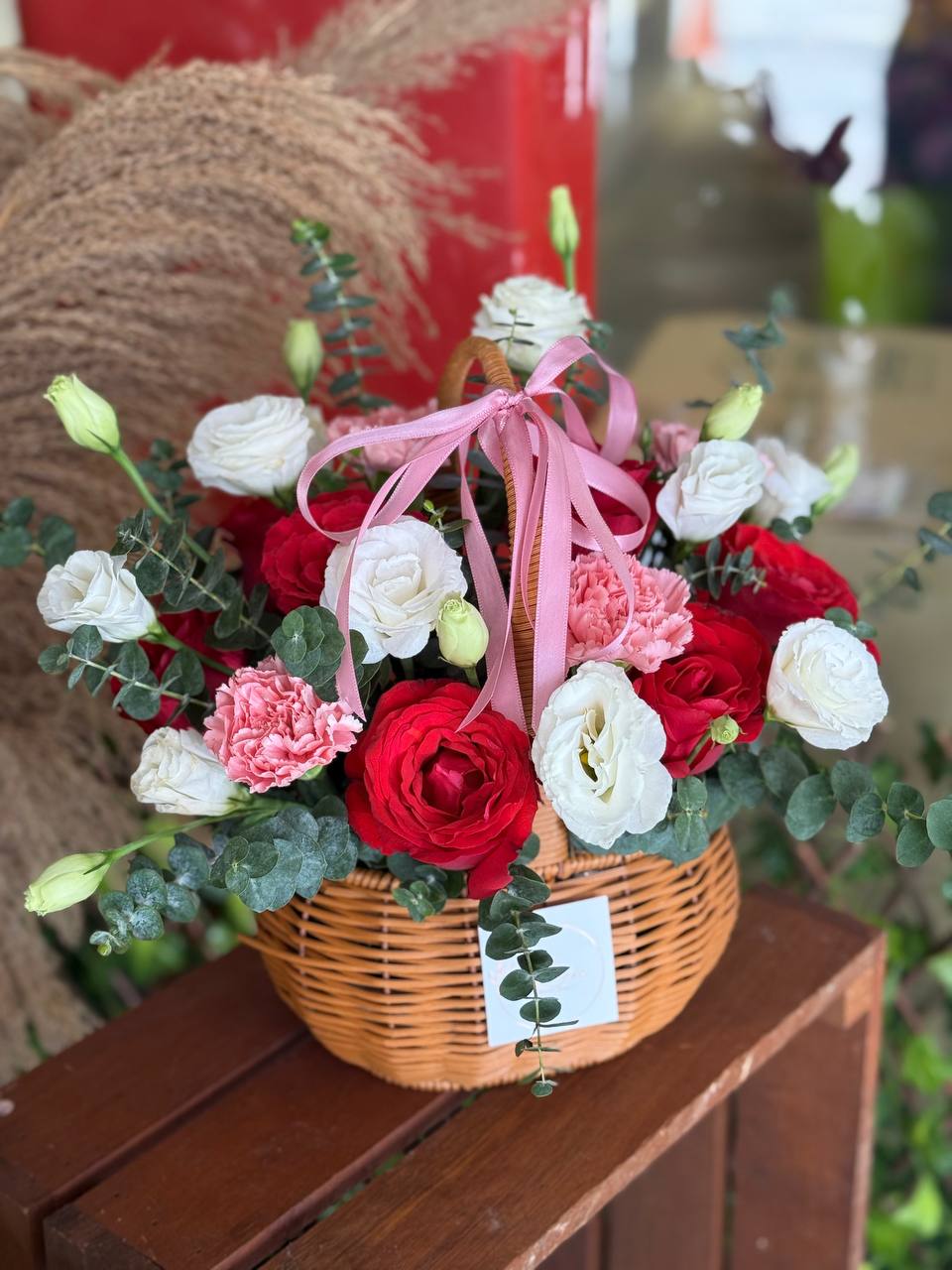 Red roses 9 stems, Soft Pink Carntions, White eustome, Baby Blue eucalpytus Leaves