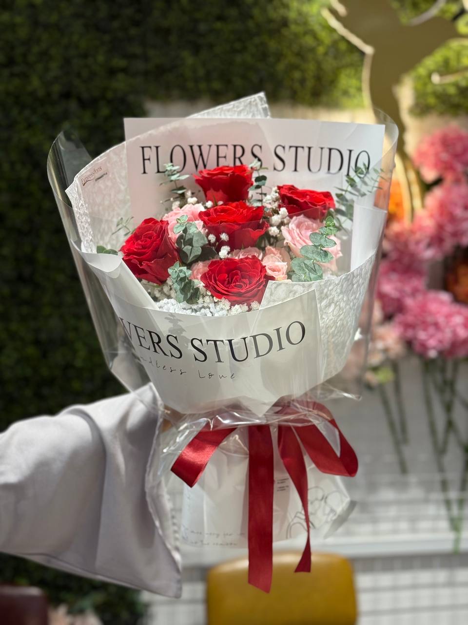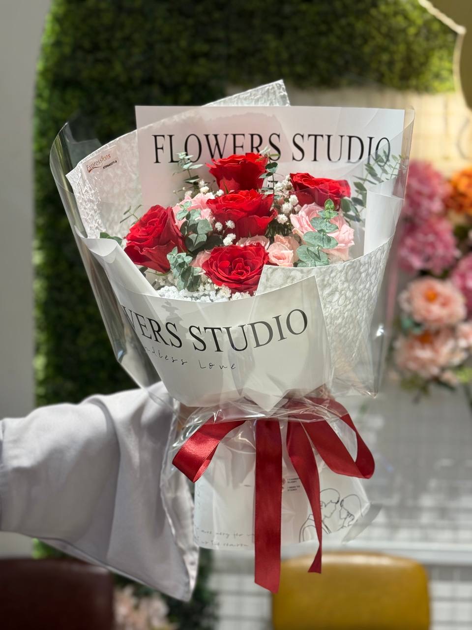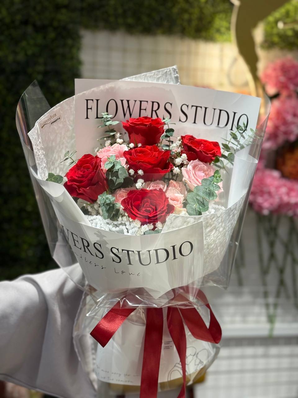 Red Roses, Pink Roses, Pink Rose Spray, Baby Blue Eucalyptus and White Baby’s Breath