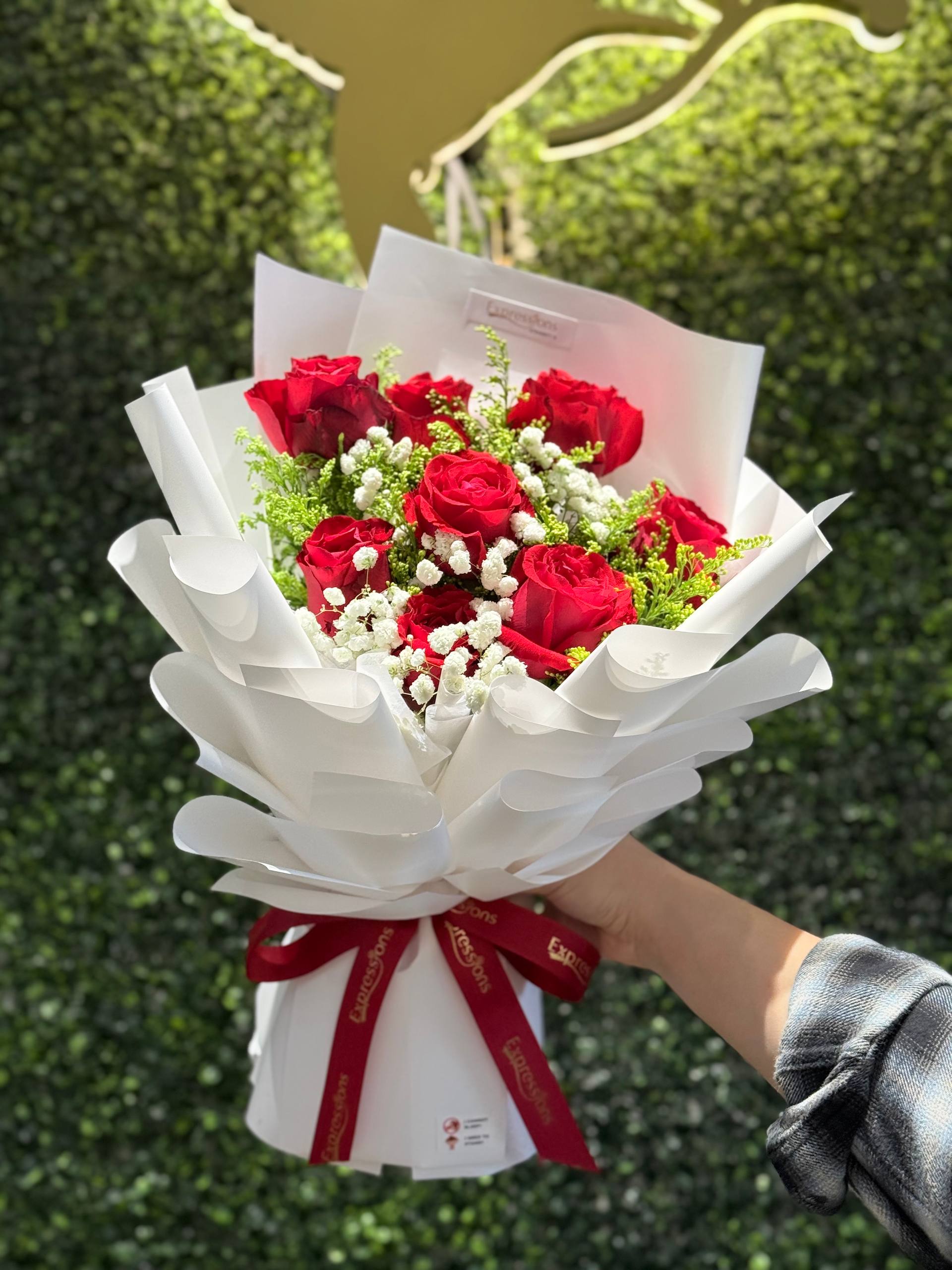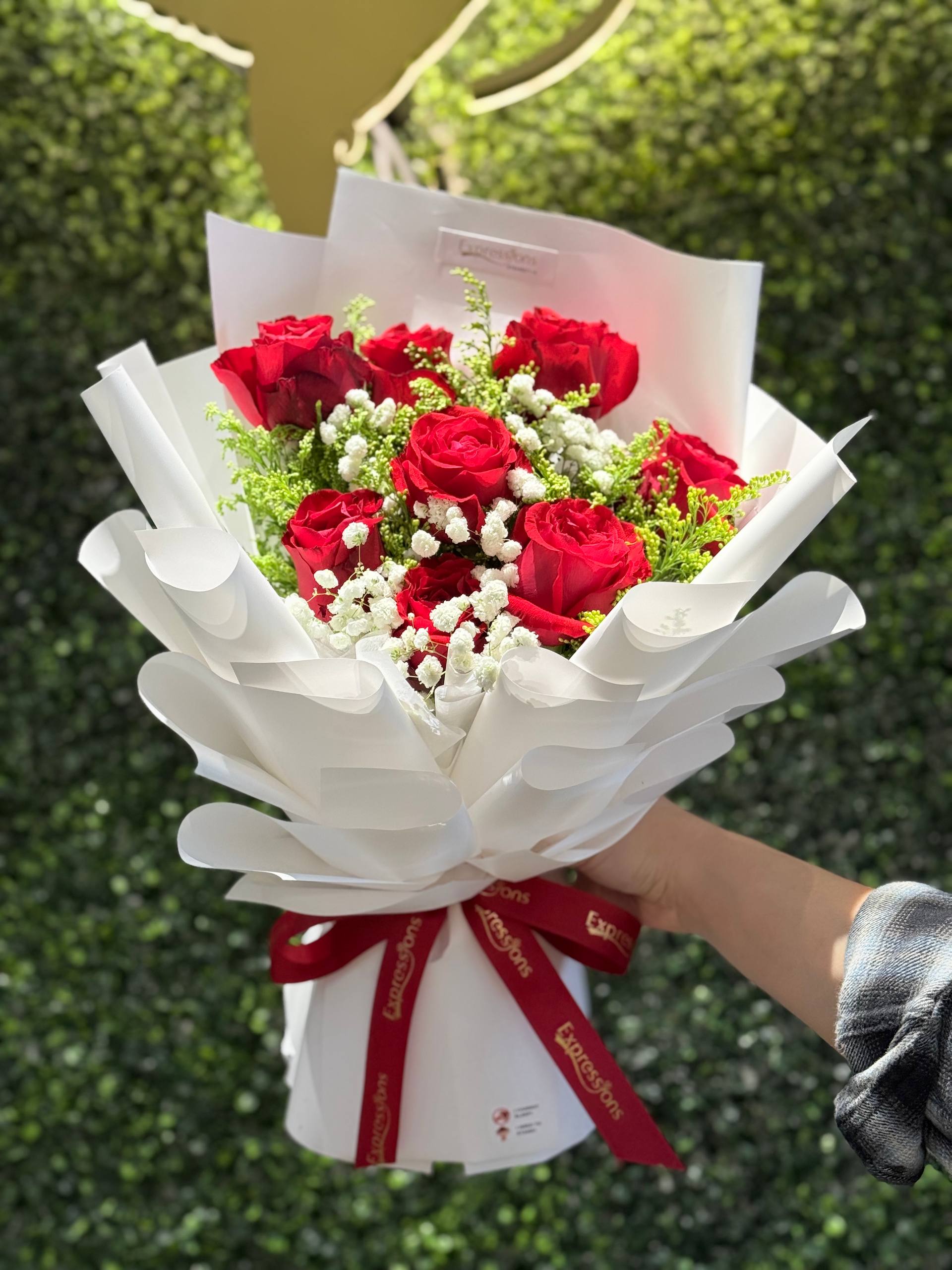 Brilliant red roses with stems of gold peacock and baby’s breath making the perfect romantic bouquet. Nothing whispers love more than a red rose.
