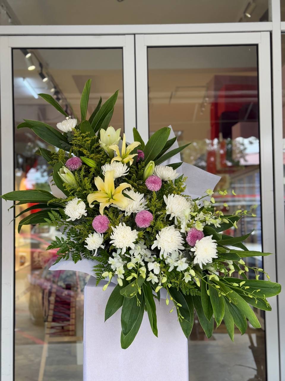 A well combinations of Yellow Lily, White Net Mum, White Orchid, Purple Ping Pong & Foliage represent the enduring memory of a loved one. They offer unwavering support during times of sorrow.