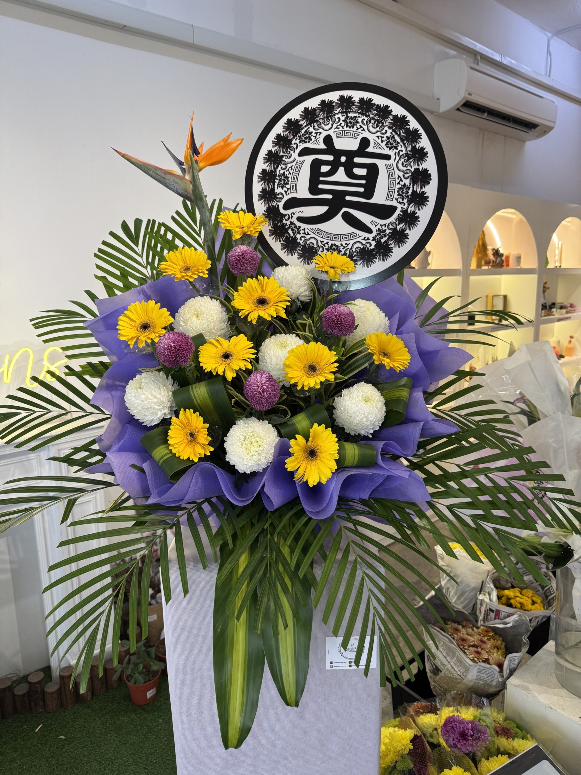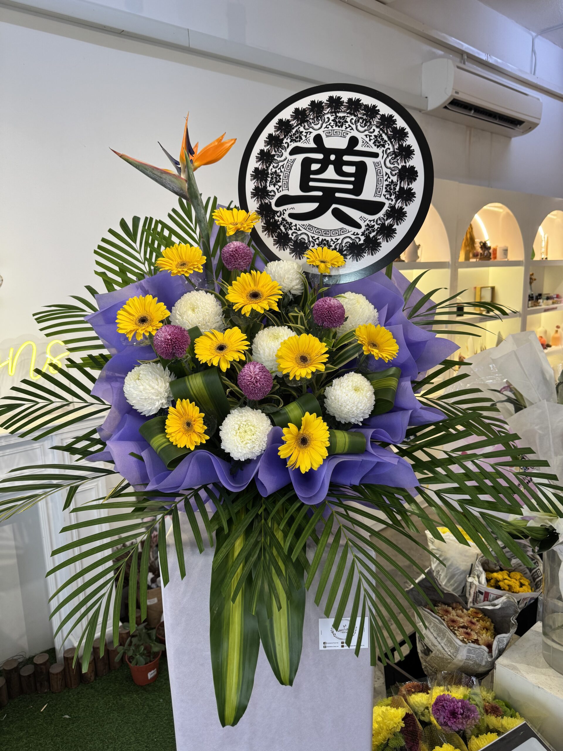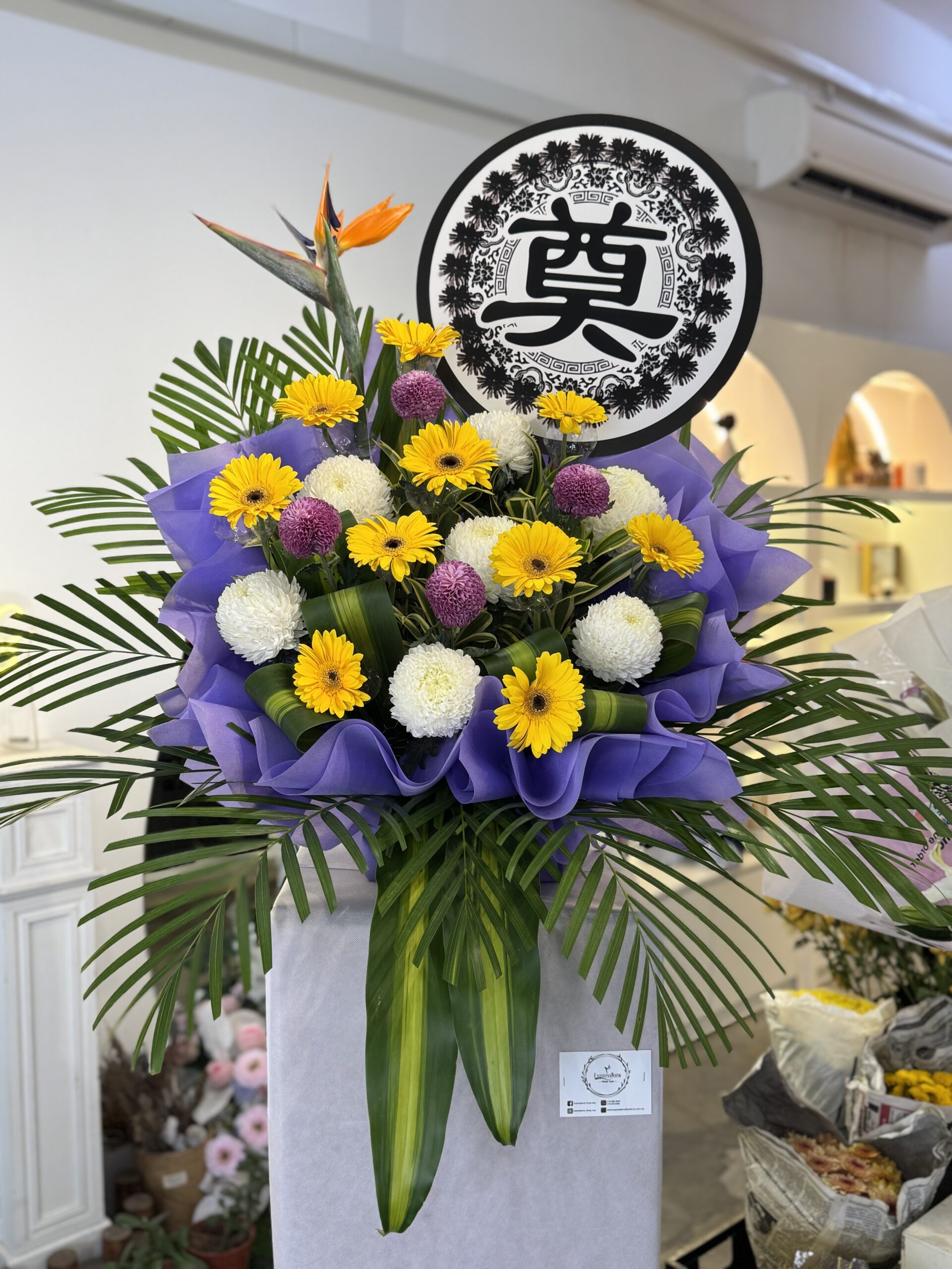 A well combinations of Yellow Gerberra, White Incurves & Purple Pingpong represent the enduring memory of a loved one. They offer unwavering support during times of sorrow.