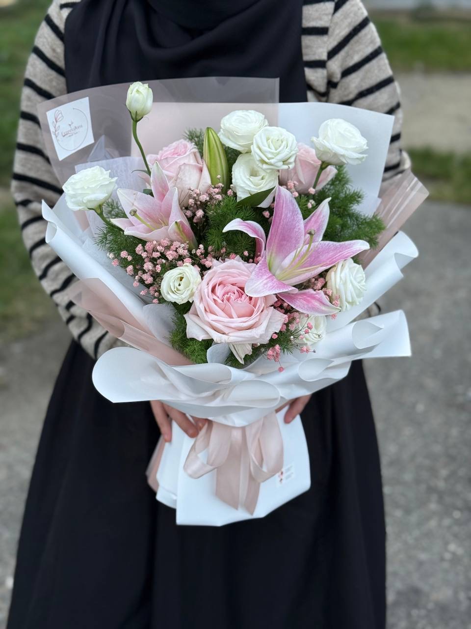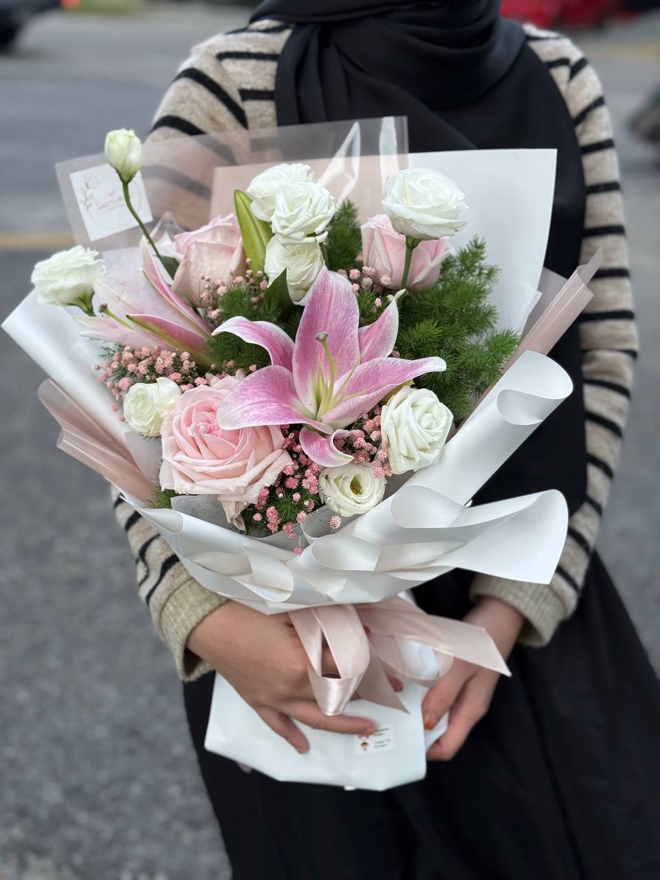 This Heavenly Grace bouquet brings its freshness in comforting, and full of love. With the blushing pink roses blend with pink lilies, it touches right of warmth. It was like a floral hug to the one who received it.