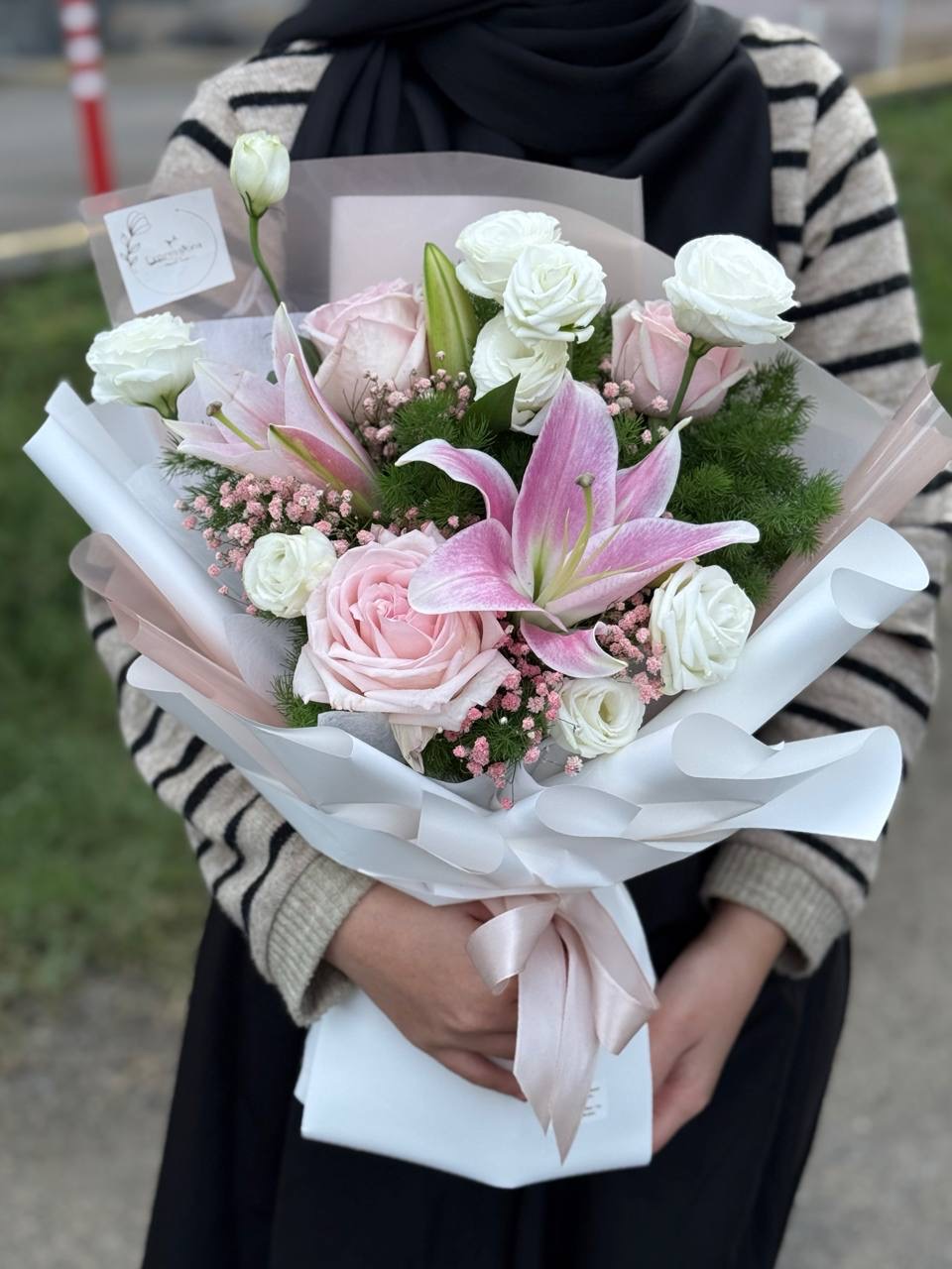 Pink Lily, Pink Roses, Pink Baby’s Breath, White Eustome & Foliage
