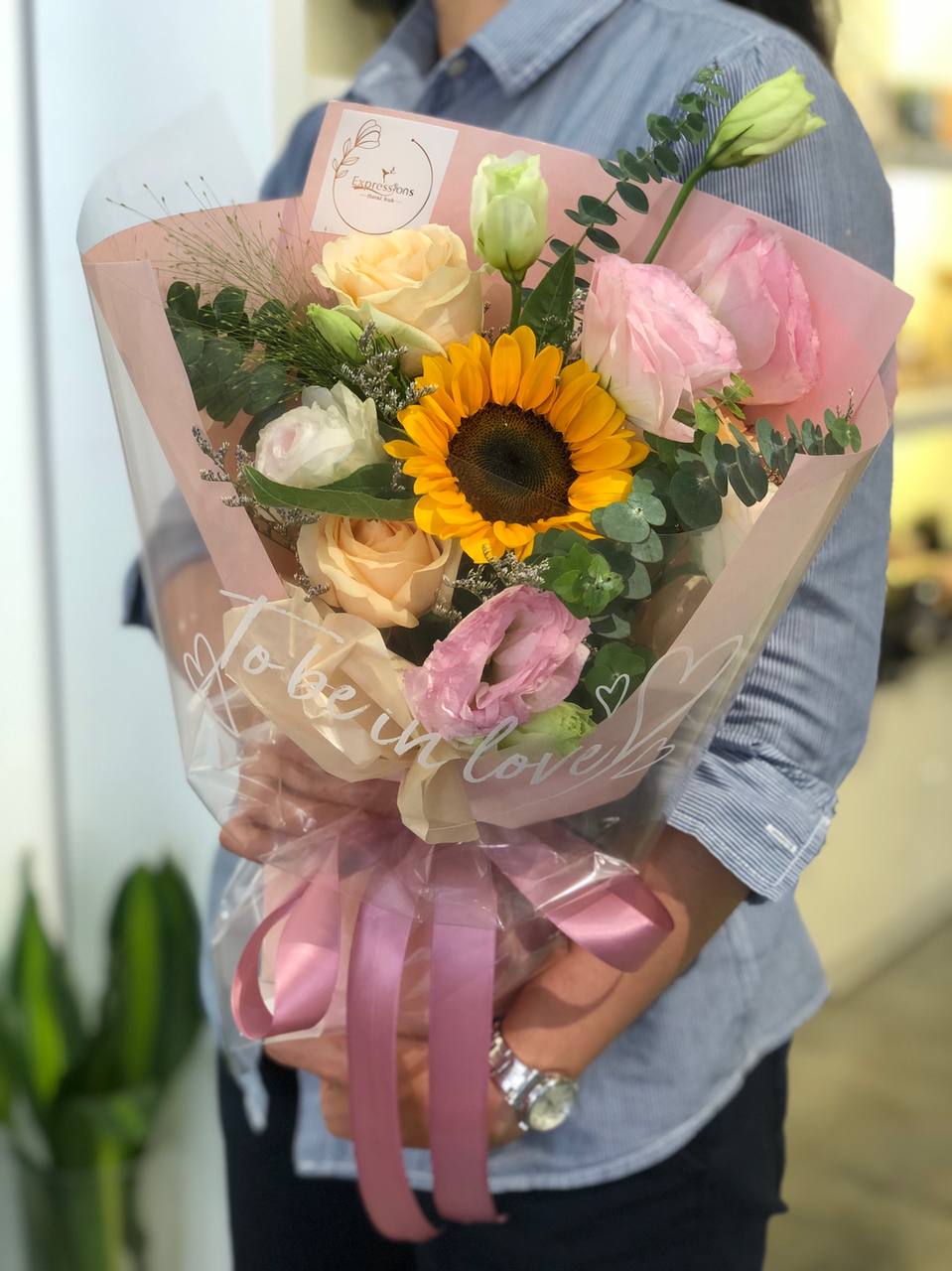 This Infinate Bloom Bouquet is really a match made in heaven, this stunning bouquet have the best use of sunflower, eustoma & roses flower. It brings the meanings of strength, resilience, love and care, which is the best to convey a success in your milestone.