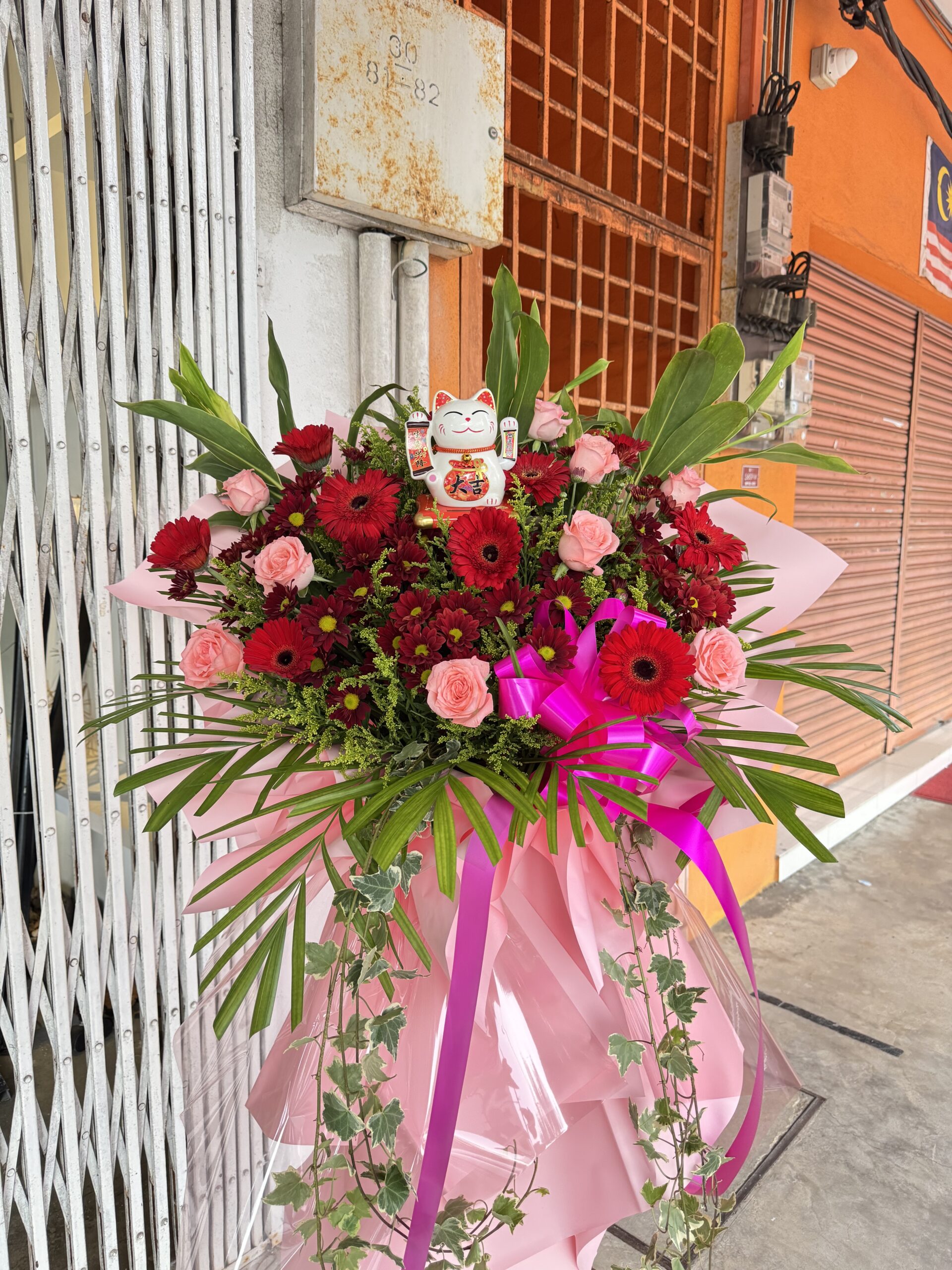 This stunning pastel pink & red tone fresh flowers will definitely bring you a very unforgettable gift to your friends or business partner.  A wealthy Lucky Cat bring another highlights to the whole opening stand. Lucky Cat symbolizes for non-stop prosperity & good fortune. Sending this elegant grand opening flower stands for new launches & opening ceremonies is definitely an impressive.