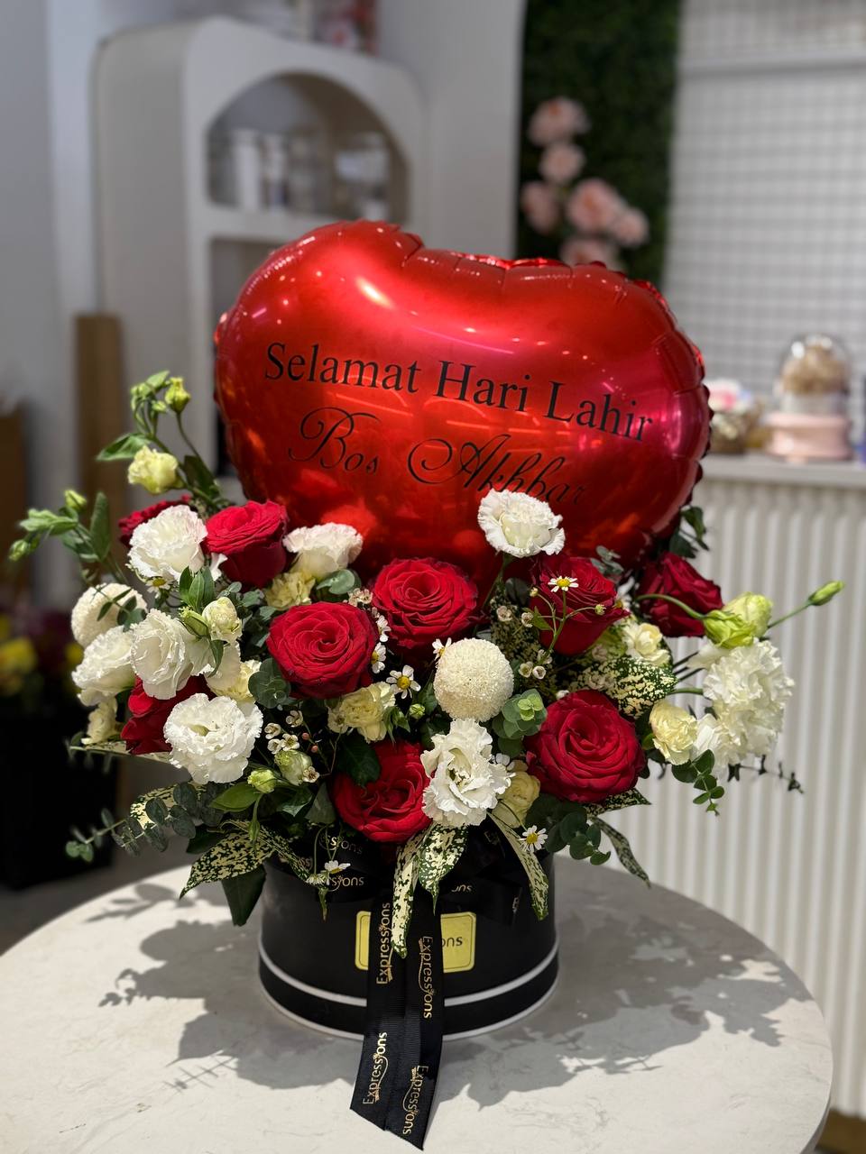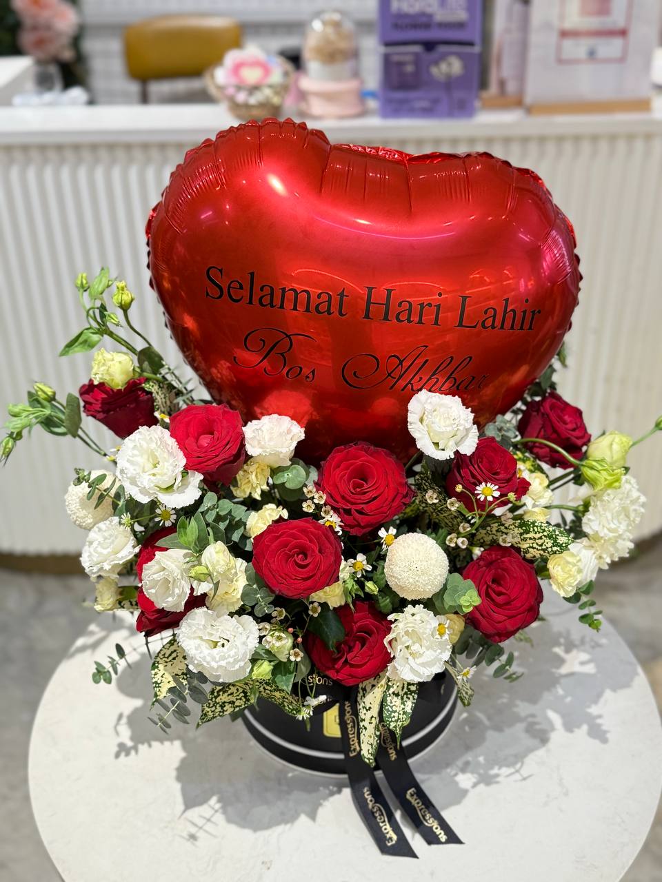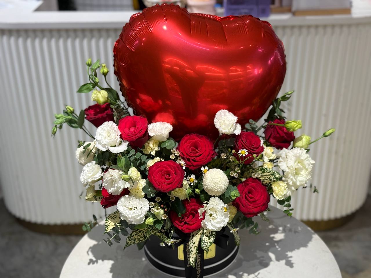Pure Love, one of our best selling flower box. It comes with fresh red rose and white eustoma adding together with a 12 inch red heart-shaped foil ballon.  Paint the town red today!