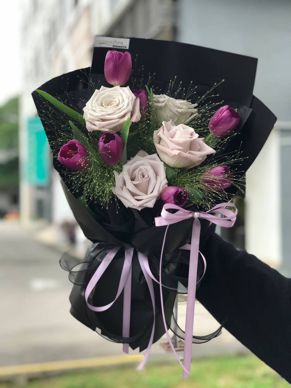 The arrangement of this Sugar Plum Korean Hand-tie bouquet features a stunning mix of soft menta roses, delicate purple tulips with intricate crimson edges.